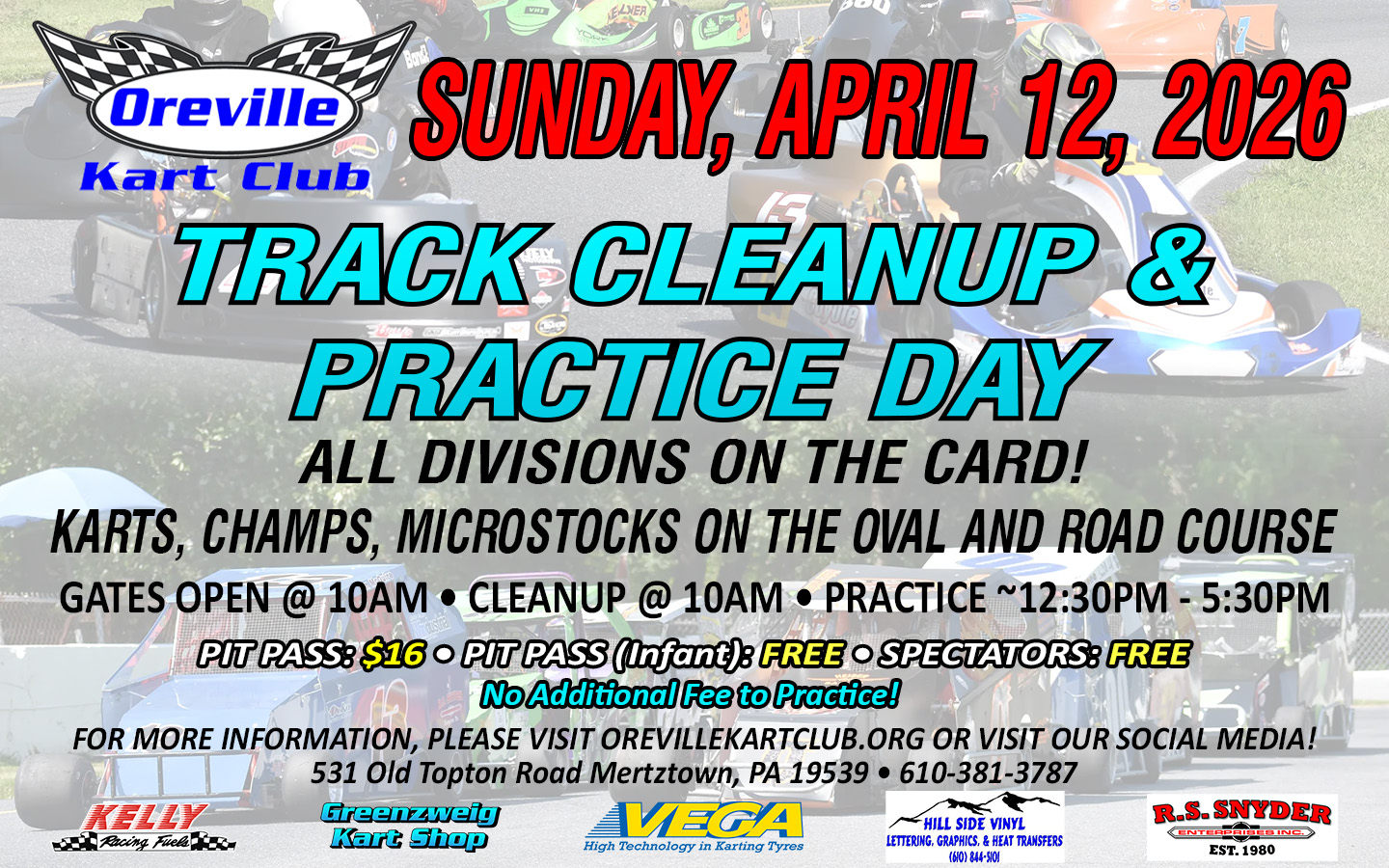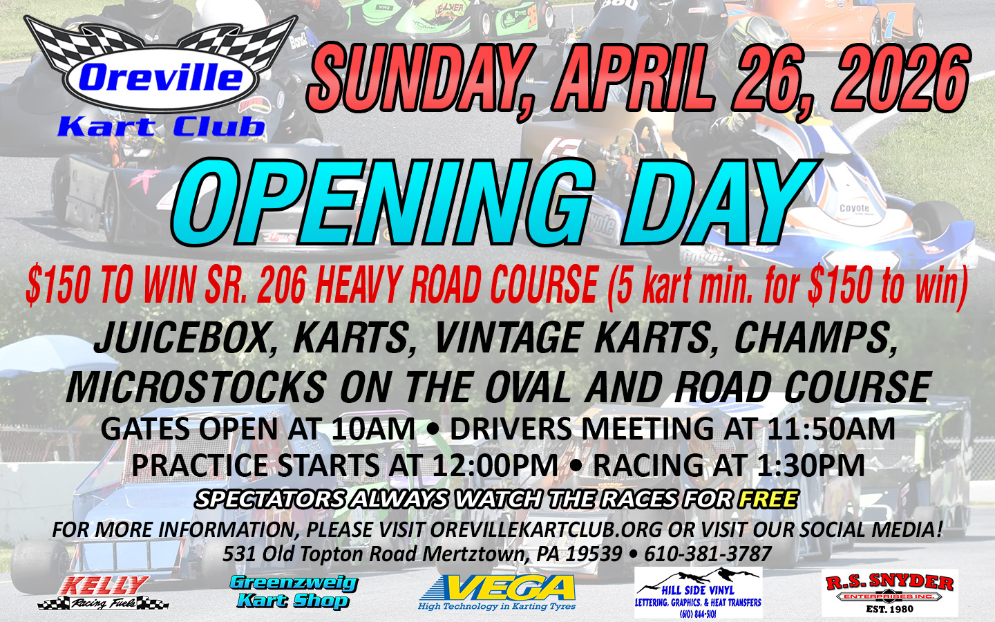 The 2026 Race Season will kick off at Oreville Kart Club on Sunday, April 26. We will have a $150 to win Sr. 206 Heavy Road Course Money Race, plus a Regular Race of All Classes on the 1/6th Mile Oval and 1/4 Mile Road Course as they start the battle for the 2026 Championships! Load those karts up and join us this Sunday for some exciting and family fun racing in the Lehigh Valley! Gates open at 10am (do not arrive earlier than 10am or park on the road), Drivers Meeting is at 11:45am, Practice will start at 12pm, and Racing will start at 1:30pm. See you all Sunday!